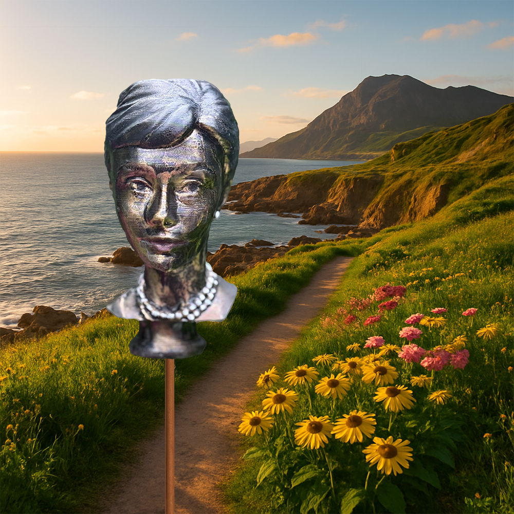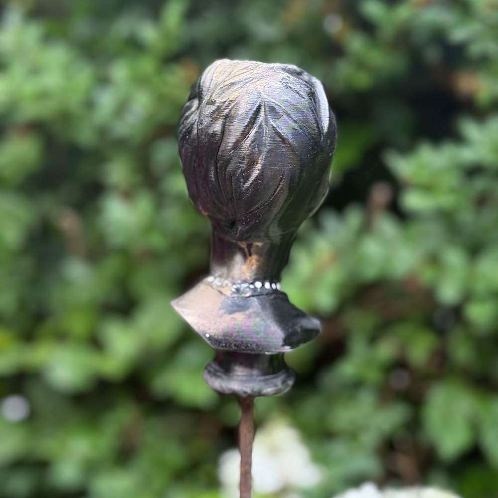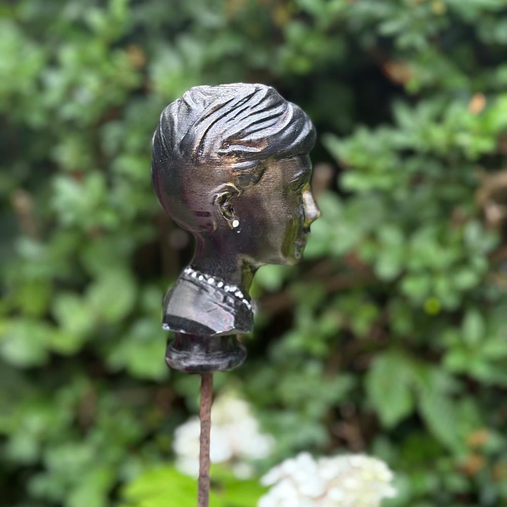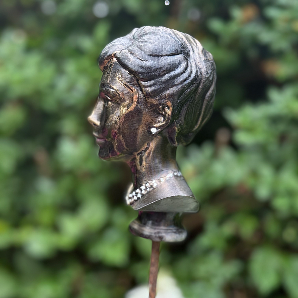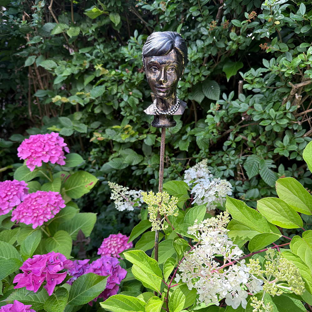 Hol Dir die zeitlose Eleganz einer wahren Stilikone direkt ins Beet! Unsere Büsten-Figur „Graceful Icon“ entsteht komplett in Handarbeit in der Braunschweiger Dekoorial-Werkstatt. Aus widerstandsfähigem Acryl modelliert, erhält die Skulptur eine edle Bronze-Patina und wird anschließend mit Klarlack UV- sowie wetterfest versiegelt. Die zierliche Figur misst 13 × 6,8 × 7,8 cm und thront auf einem schlanken Metallstab, der sich mühelos in Erde, Pflanzkübel oder Rasen stecken lässt. Feine Gesichtszüge, der charakteristische Pixie-Cut und eine zarte Perlenkette verleihen der Büste eine unverwechselbare Anmut, die zwischen Hortensien, Rosen oder Kräutern sofort ins Auge fällt. Dank der Schutzschicht bleiben Glanz und Details auch bei starker Sonne, Regen oder Frost dauerhaft erhalten. Jedes Exemplar ist nummeriert und somit ein echtes Unikat – handgemacht, lokal und nachhaltig. Ob als stilvoller Blickfang im Cottage-Garten, als besonderes Geschenk für Film- und Kunstliebhaber*innen oder als edles Statement auf Balkon und Terrasse: „Graceful Icon“ sorgt garantiert für Gesprächsstoff und bringt jeden Tag ein Stück Hollywood-Charme in Dein grünes Reich.